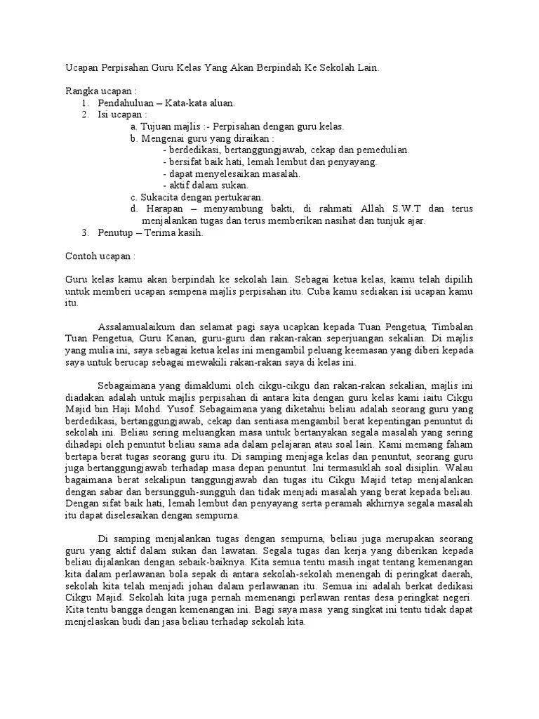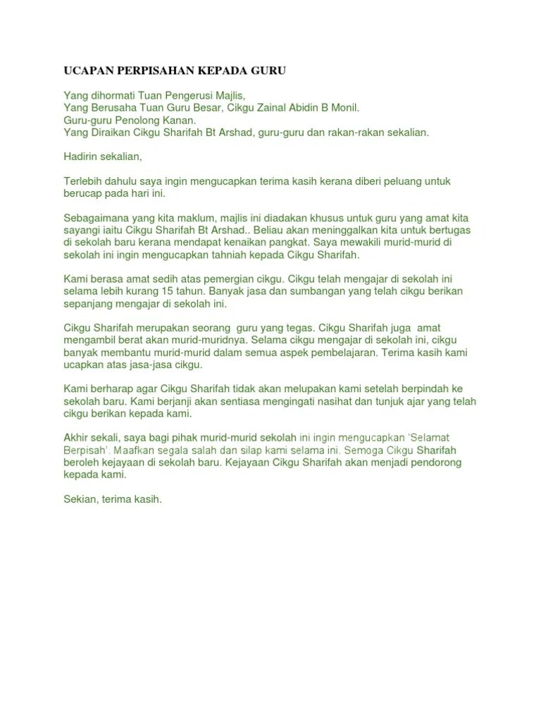 Ucapan perpisahan untuk guru sangat mengesankan apabila diucapkan secara langsung . Pidato perpisahan guru yang pindah sekolah contoh soal sing a song. Di hari itu biasanya kenangan bersama guru akan . Dalam lingkungan bersekolah, perpisahan pasti selalu ada, baik berpisah dengan teman maupun dengan guru dan kepala sekolah. Berpisah dengan guru atau kepala sekolah yang disenangi merupakan momen yang mengharukan. Contoh teks ucapan perpisahan guru. Yang dihormati hajah robayah binti sidek guru penolong kanan satu. Ucapan selamat purna tugas pensiun. Ucapan perpisahan bisa disampaikan kepada guru . Contoh ucapan perpisahan untuk guru yang pindah tugas. Kata kata bijak siswa untuk guru anamyhusna blog s baca juga:40 kata kata perpisahan sekolah bikin nangis, penuh makna mendalam 33 kata kata selamat jalan .